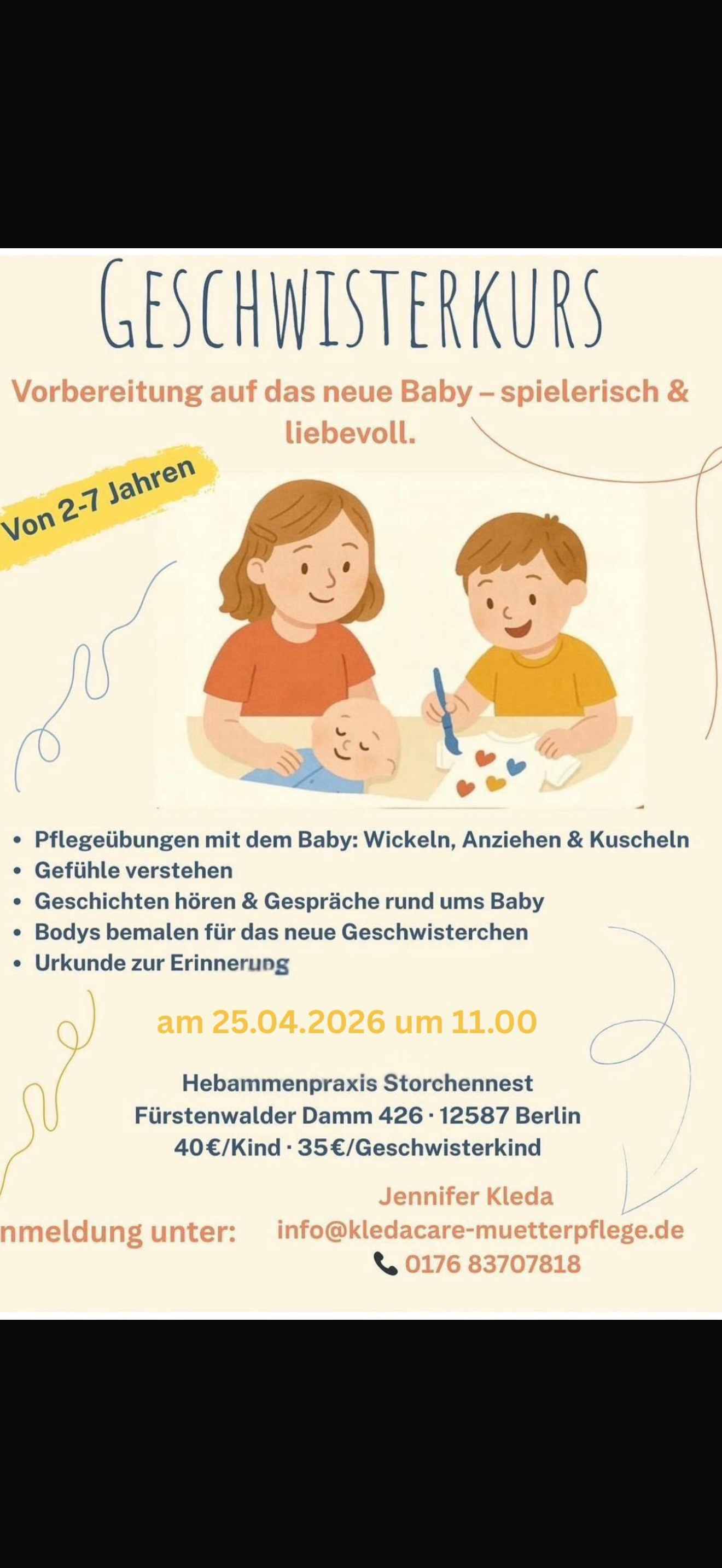 Unser Geschwisterkurs richtet sich an Familien, die ihre Kinder optimal auf die Ankunft eines neuen Familienmitglieds vorbereiten möchten. In entspannter und kindgerechter Atmosphäre lernen große Geschwister, wie sie ihren neuen Bruder oder ihre neue Schwester unterstützen und begleiten können. Spielerisch vermitteln wir Wissen über die Bedürfnisse von Babys, den richtigen Umgang und worauf beim gemeinsamen Alltag zu achten ist. Der Kurs fördert nicht nur das Verständnis, sondern auch die Bindung zwischen den Geschwistern und stärkt das Selbstbewusstsein der älteren Kinder. Gemeinsam schaffen wir so eine harmonische Basis für das neue Familienleben.